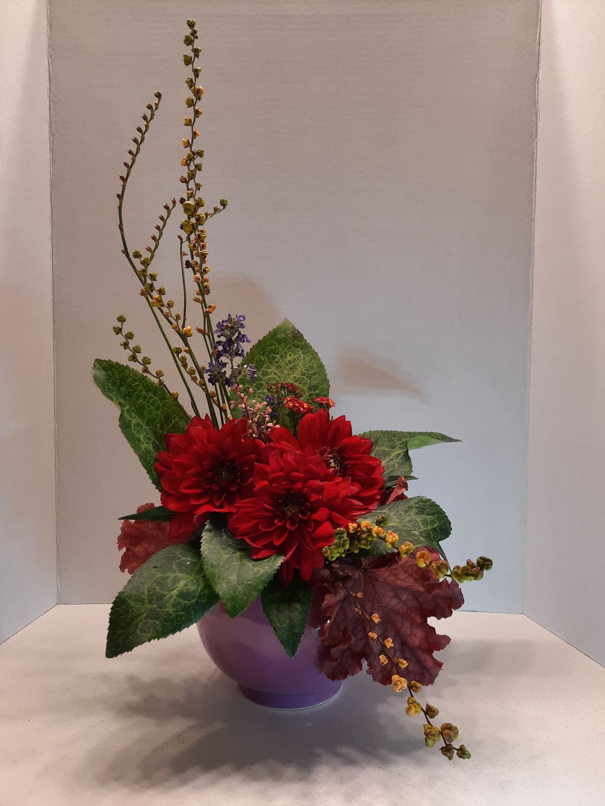 Helleborus orientalis, Crocosmia ‘Limpapo”, Heuchera peachberry ice, Dahlia,red, Vitex Delta Blues, Yarrow