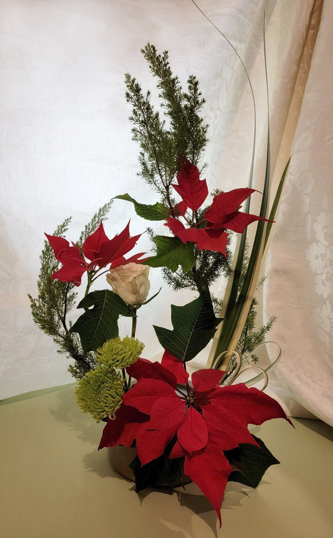 The materials are poinsettia, tree heather, green mum, rose, and variegated iri