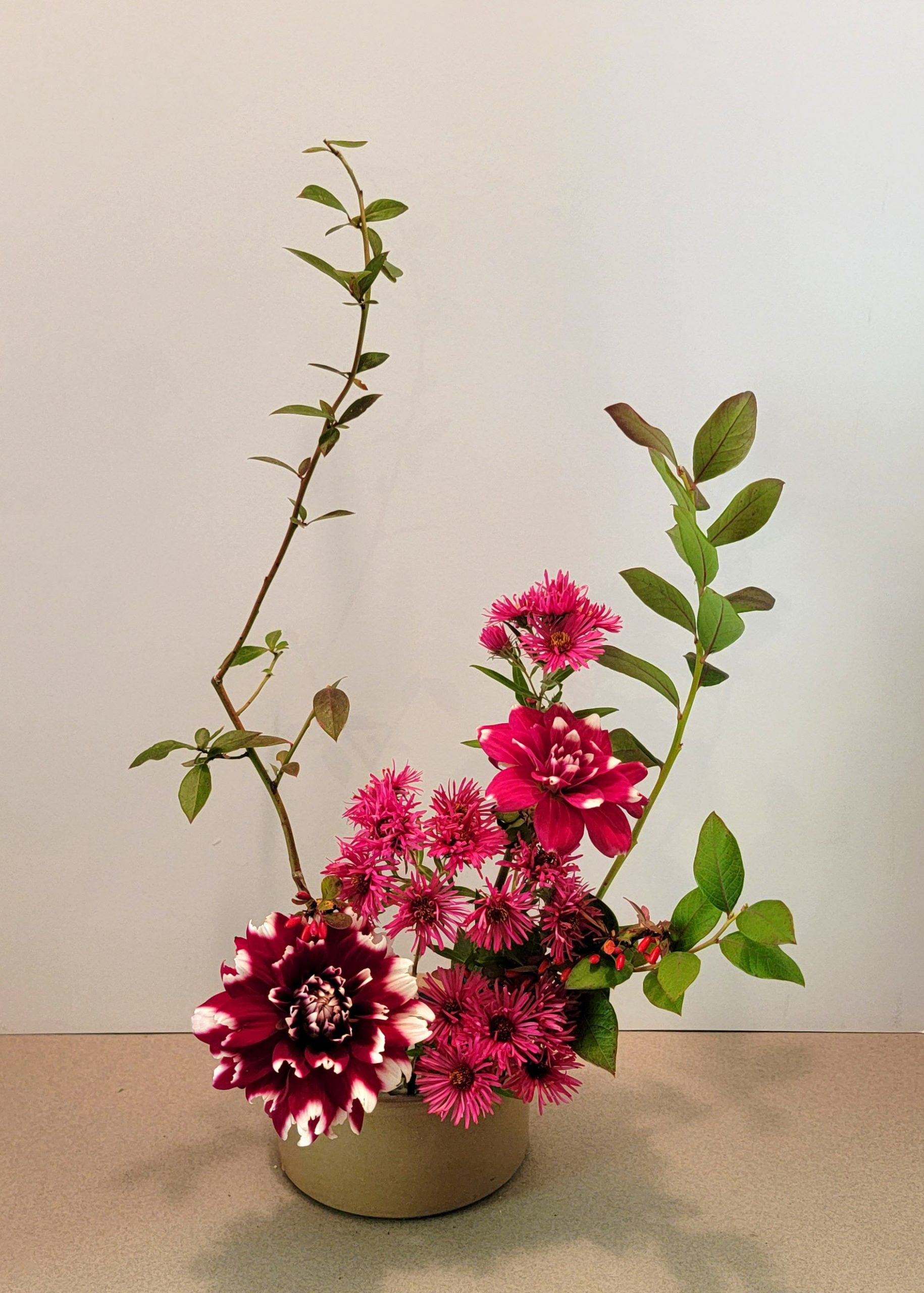 Vaccinium corymbosum cv., Dahlia pinnata ‘Duet’, Berberis thunbergii ‘Rose Glow’, Aster ‘Alma Potschke’.